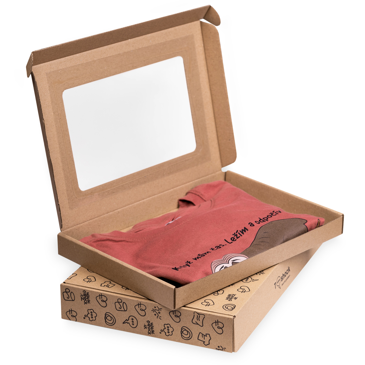 Dárková kartonová krabička vhodná jako stylové balení na tričko s potiskem, které chcete věnovat jako dárek. Vhodné balení také na plátěnou tašku. Krabička je vyrobena z pevného kartonu s plastovým průhledným okénkem, dodáváme ji ve složeném stavu. Originální dárkové balení s razítkem garance překvapení!